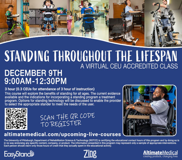 This course will explore the benefits of standing for all ages. The current evidence available and the indications for incorporating a standing program a treatment program. Options for standing technology will be discussed to enable the provider to select the appropriate stander to meet the needs of the user.
